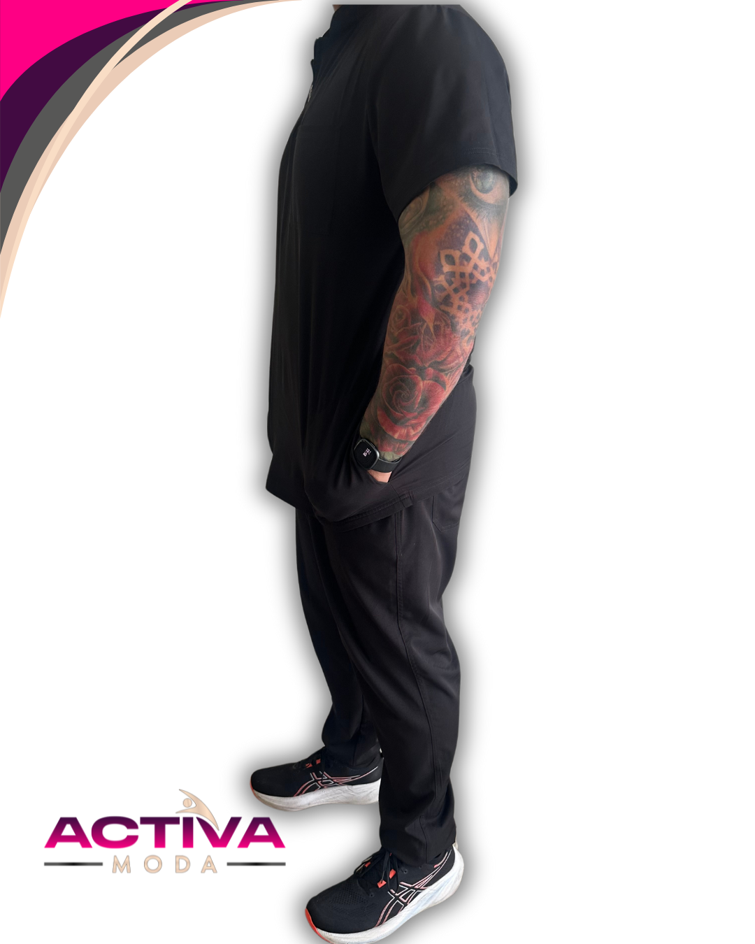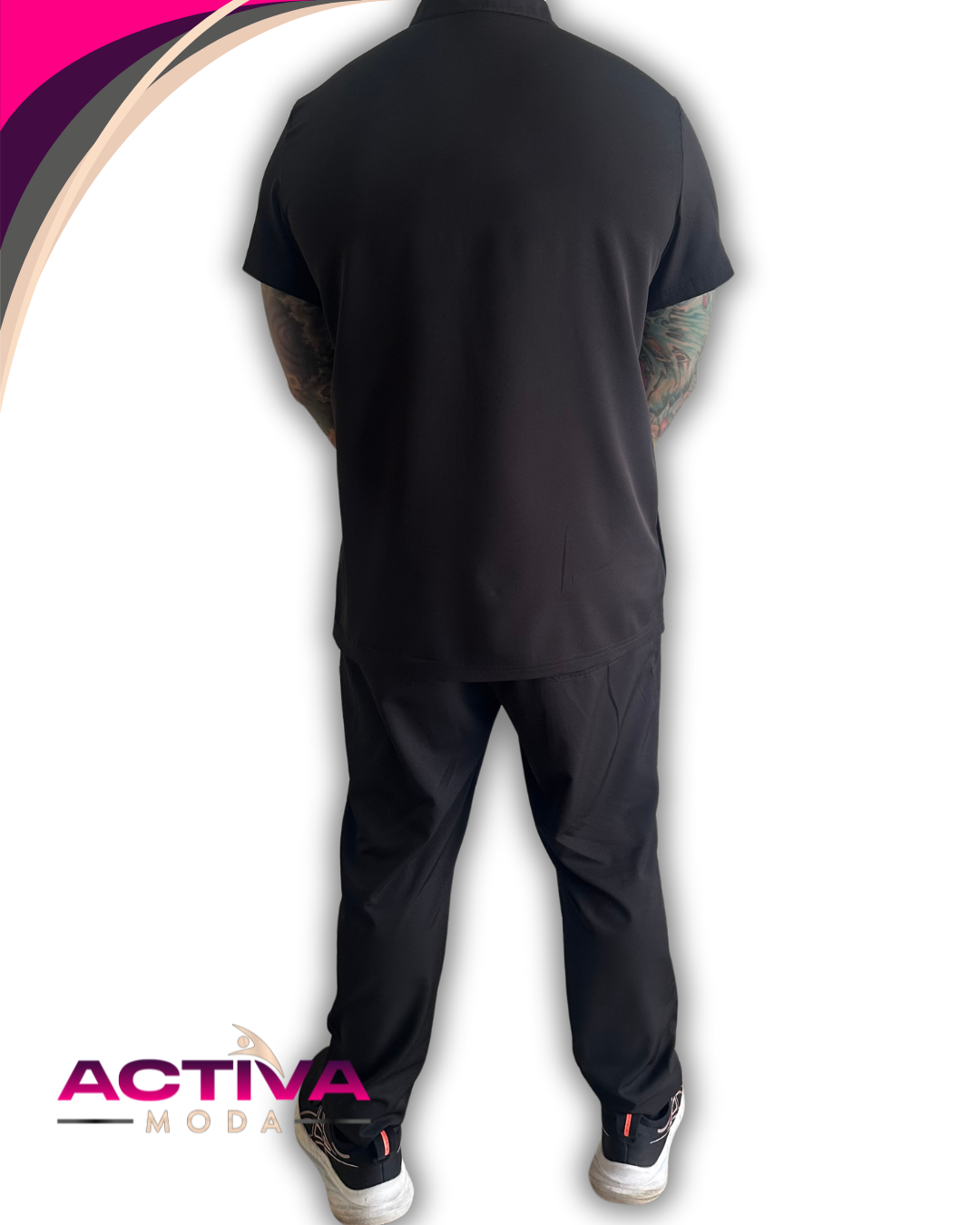 La camiseta de manga corta presenta un elegante cuello en V, mientras que los pantalones tienen un diseño estilo jogger con elástico y cordón para un ajuste completamente funcional. Disponible en color negro, este set es el equilibrio ideal entre comodidad y estilo.